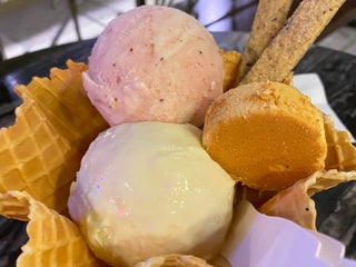 入口で日本語のメニュー兼オーダーシートをもらえます。ダブルのワッフルコーンなし、トッピング2つ選べて160元でした。それでもかなりのボリューム。。バナナアイスがピンク色で驚きました。
