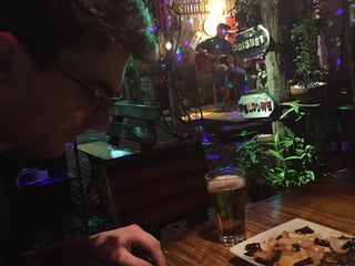 Lovely atmosphere, very pretty & green surroundings with fairy lights at nice, tasty food, soothing live music!