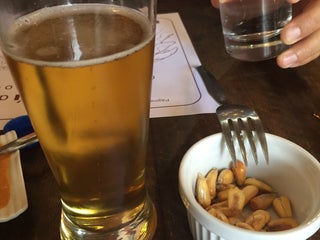 Anticuchos, tamalito verde, tacu tacu de pallares con lomito, red lager.